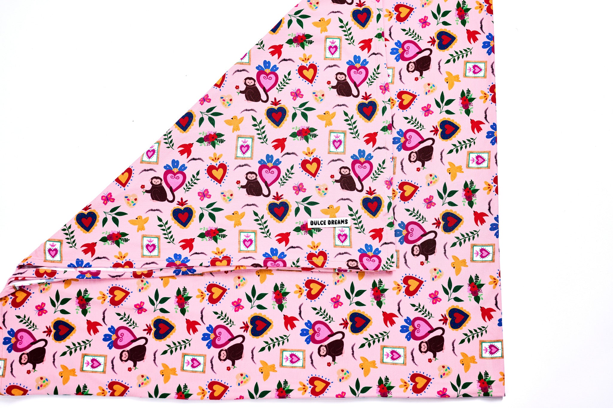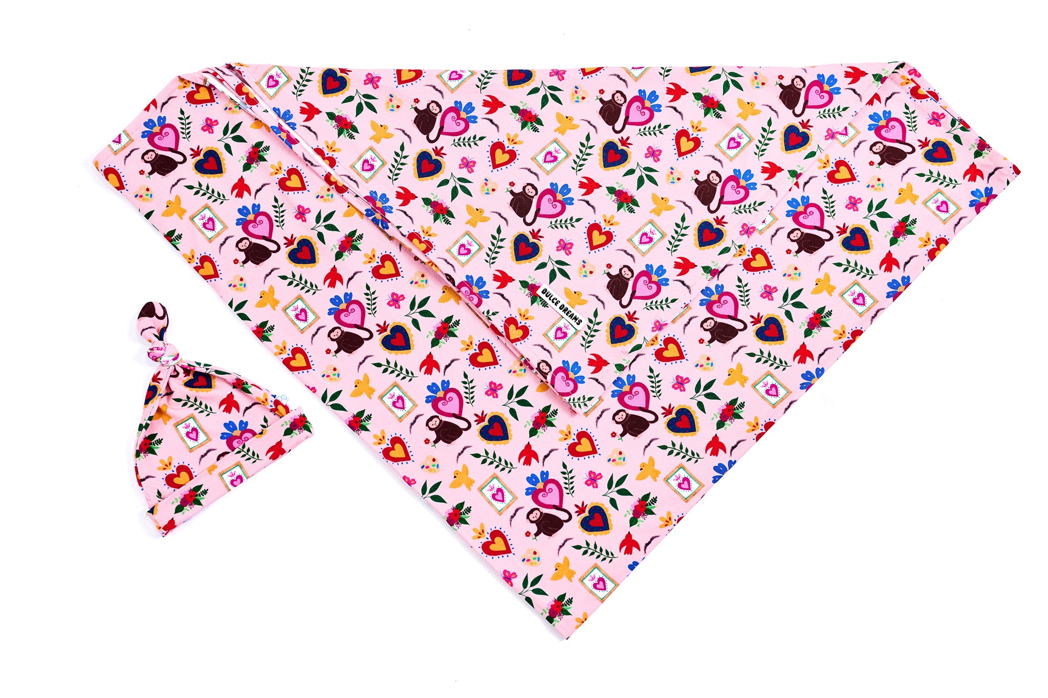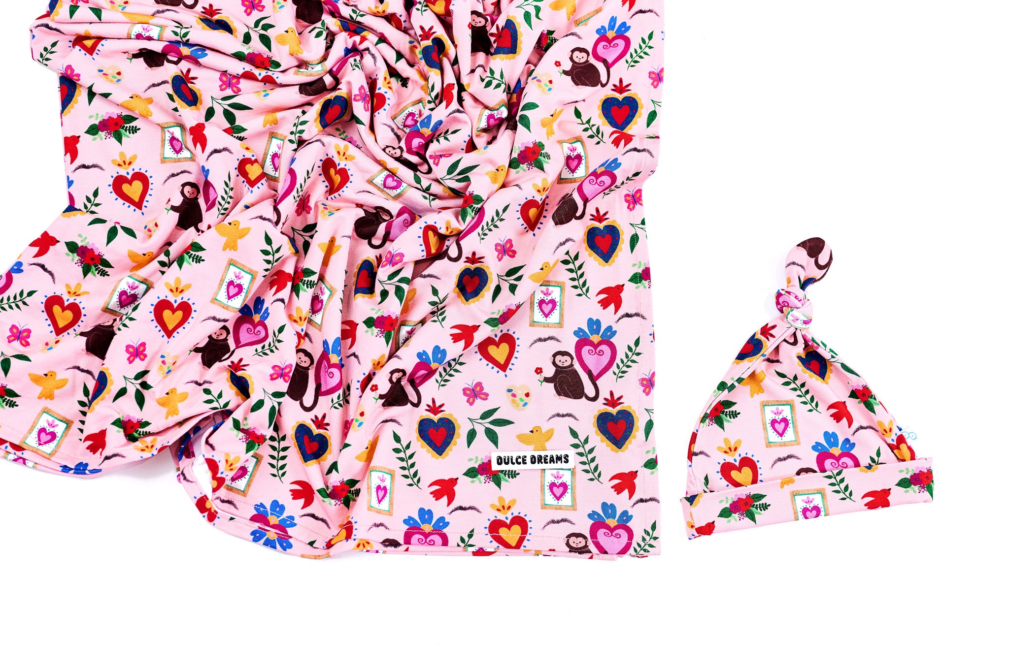 Introduce your new baby to the world in this Frida swaddle and beanie set inspired by the iconic Frida Khalo’s wondrous art. This swaddle can also be used as a nursing and stroller cover.